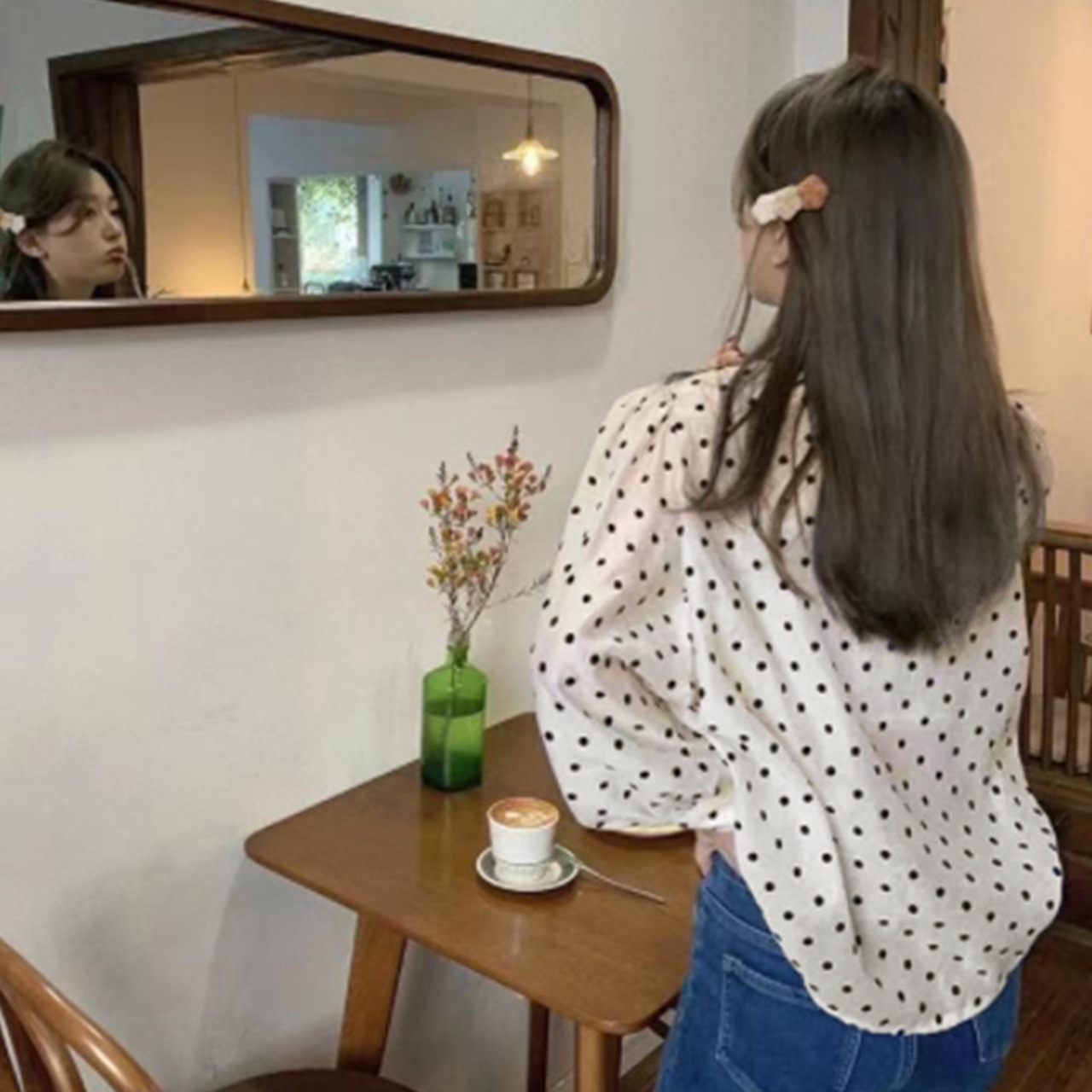 衿元のリボンと大きな袖がクラシックな可愛さを醸し出すドット柄長袖ブラウス