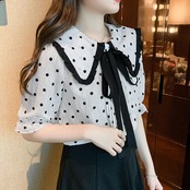 可愛い セーラーカラーブラウス 水玉シャツブラウス 半袖 シフォンブラウス リボンタイブラウス 春夏秋 袖フリルレトロ風