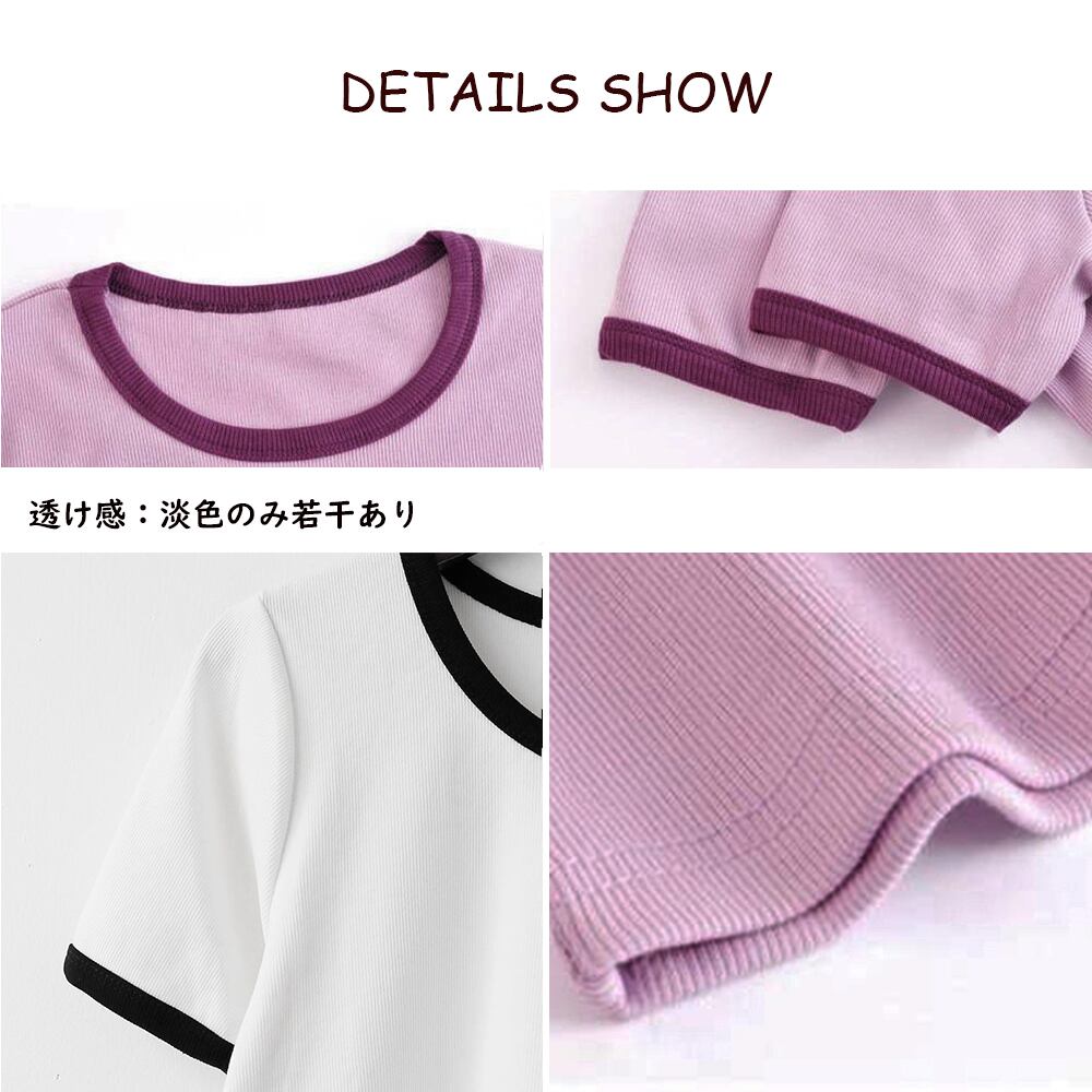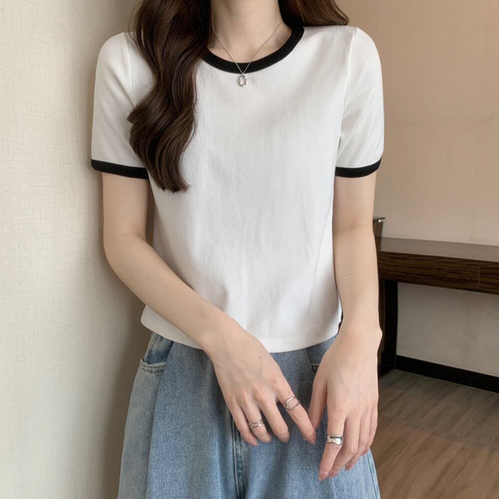 ネックと袖のバイカラーデザインはお洒落な半袖リブカットソー