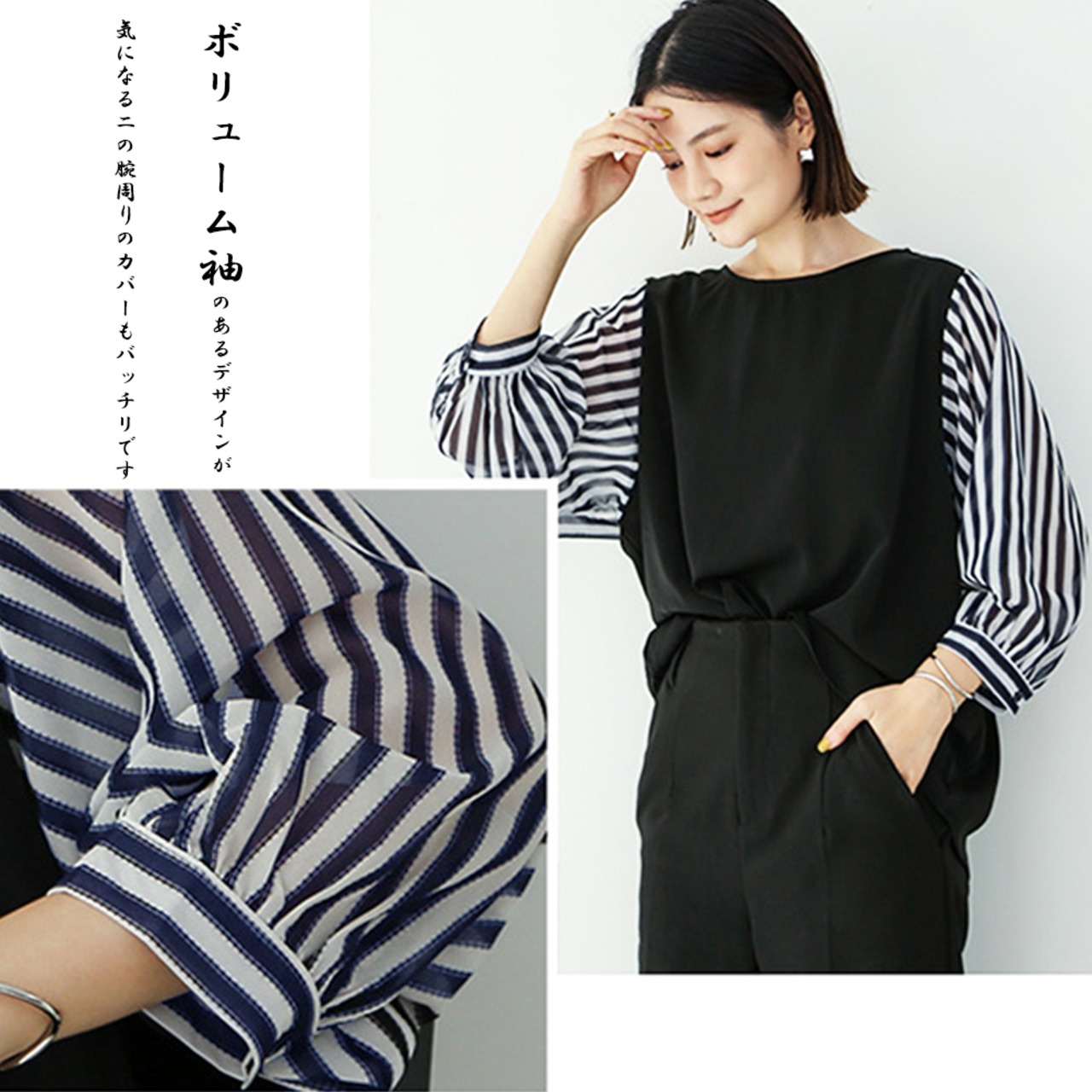 ドッキングトップス オフィスカジュアル レディース 着やせ ゆる 着回し 異素材 切り替え ボリューム袖 ストライプ