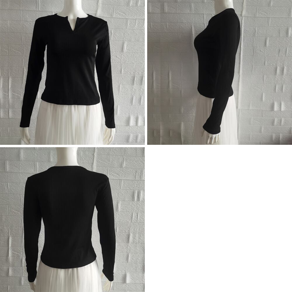 フロントに開いたVネックが女性らしいシルエットにしてくれるシンプルな長袖ニットトップス