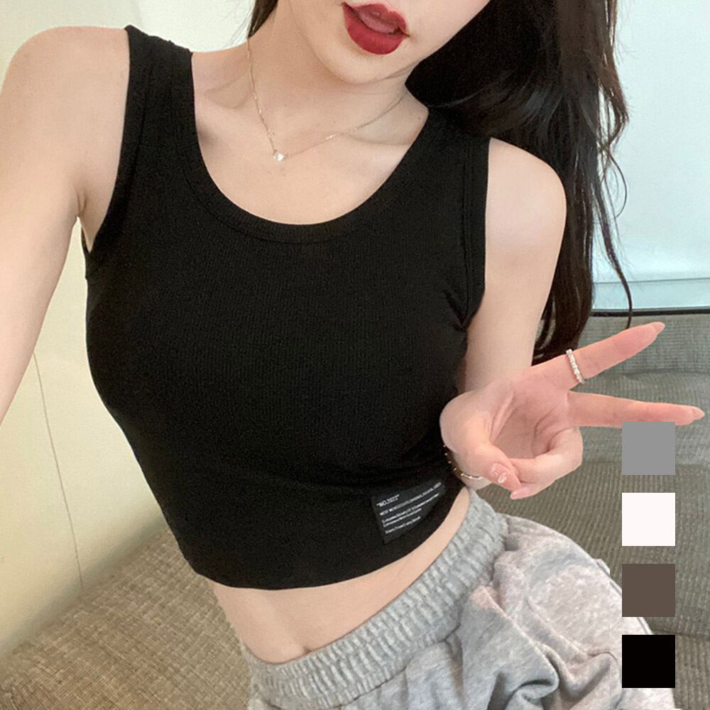 リブニットタンク クルーネック 春夏ブラトップ 楽ちん 幅広ストラップ ショート丈 盛れる インナートップス 英字ロゴ