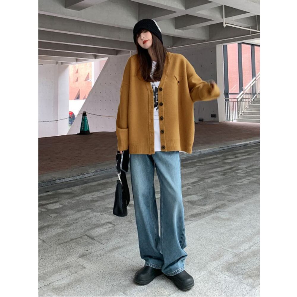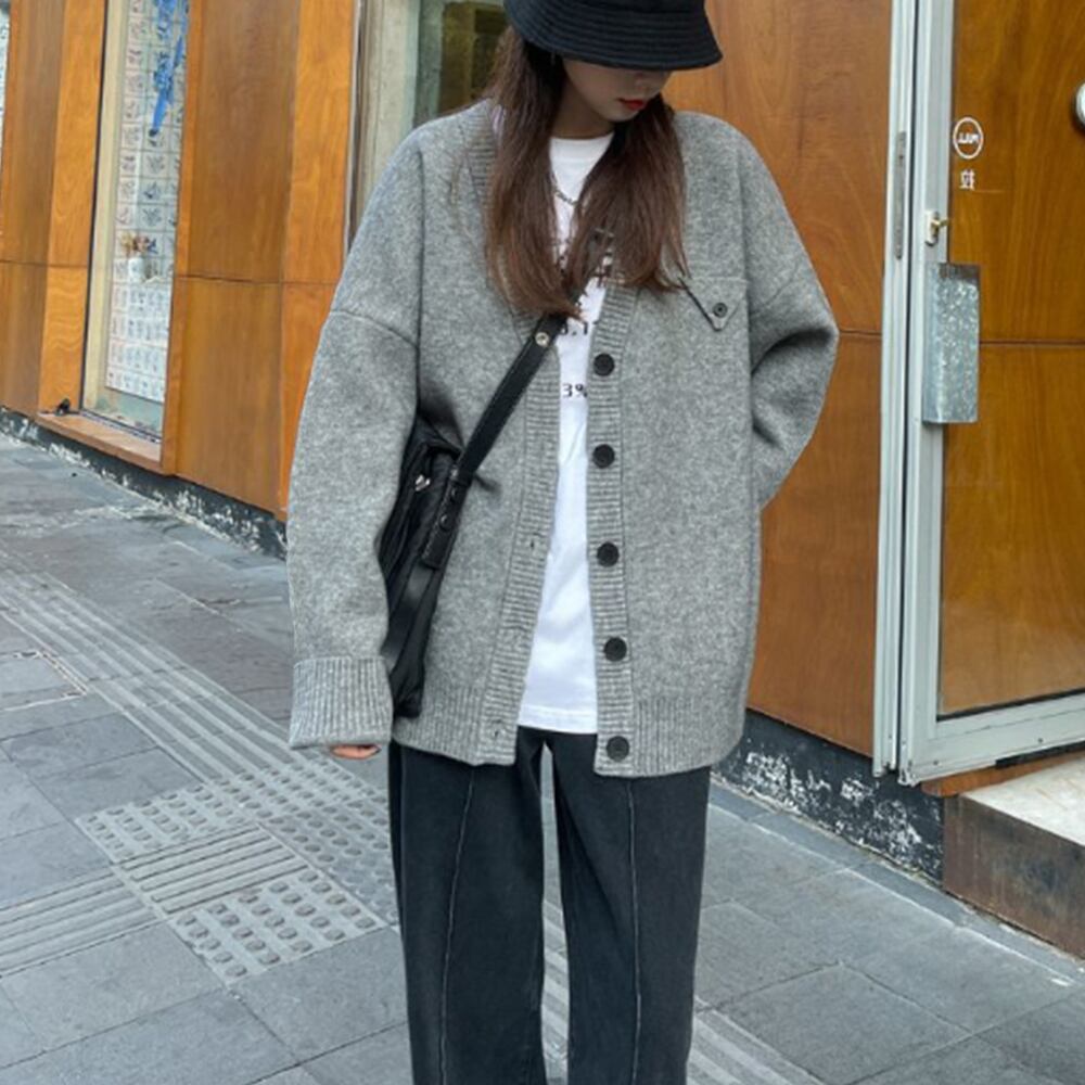 ゆったり ニットカーデ 無地長袖 ニットソー vネック 前開き 女子ニット 人気アイテムトップス 体型カバー羽織 韓国風