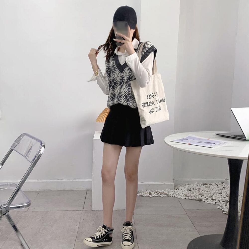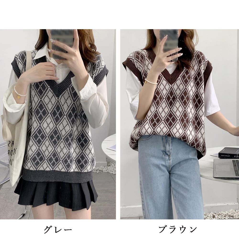 ジャカードニットベスト Vネック アーガイル柄 ベスト 学院風 重ね着ニット レイヤードベスト レトロ体型カバー