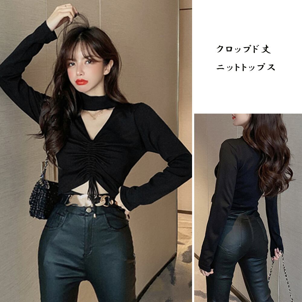 レディース ニットカットソー セクシー クロップド丈 長袖 フェミニン ニットプルオーバー 無地 着やせ Vネック