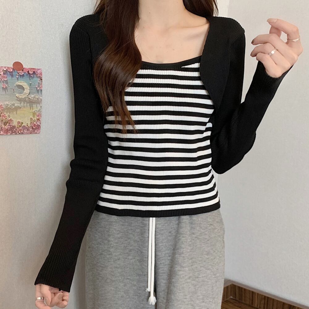 ボーダー柄身頃と無地袖を合わせたレイヤード風デザインが目を惹くスクエアネックニットトップス