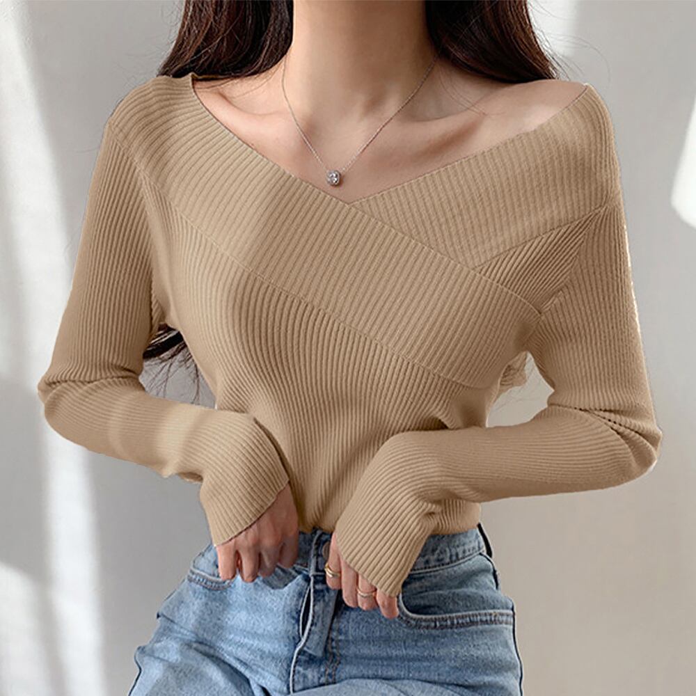 レディース リブニット ニットセーター 無地 長袖 クロス 鎖骨見せ セクシー お洒落 着やせ 大人 可愛い