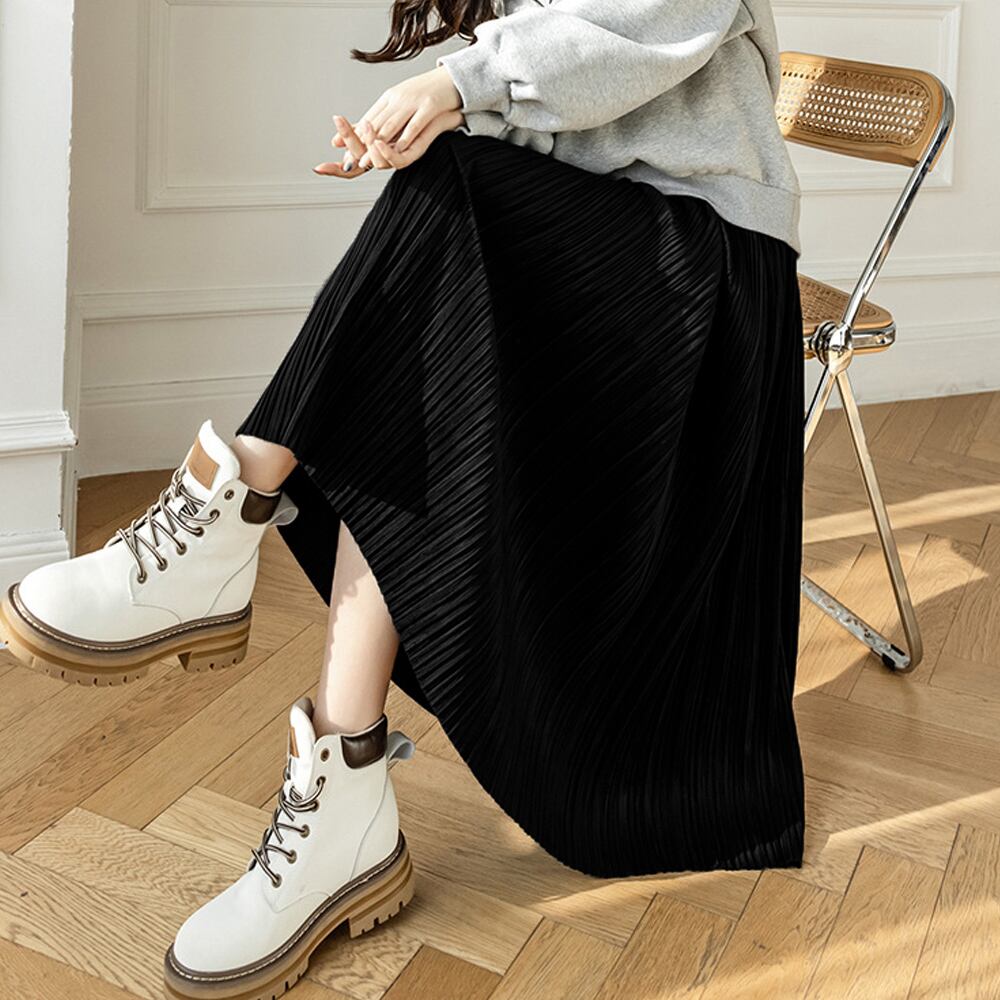 細かいプリーツデザイン、歩くたびに綺麗に広がるプリーツは女性らしさを演出するスカート