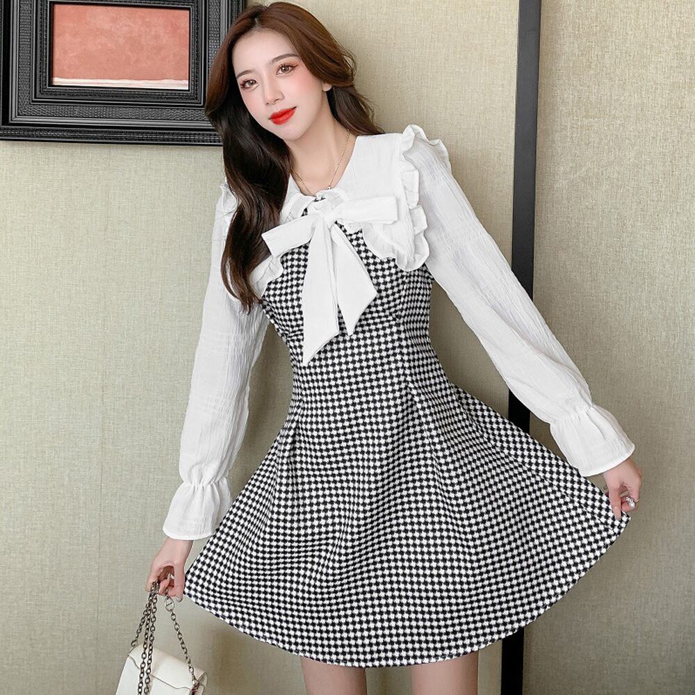 千鳥格柄ワンピース ハイウエスト フレアスリーブ リボンタイ Aライン 可愛い フェミニン 春秋 人気 きれいめワンピ