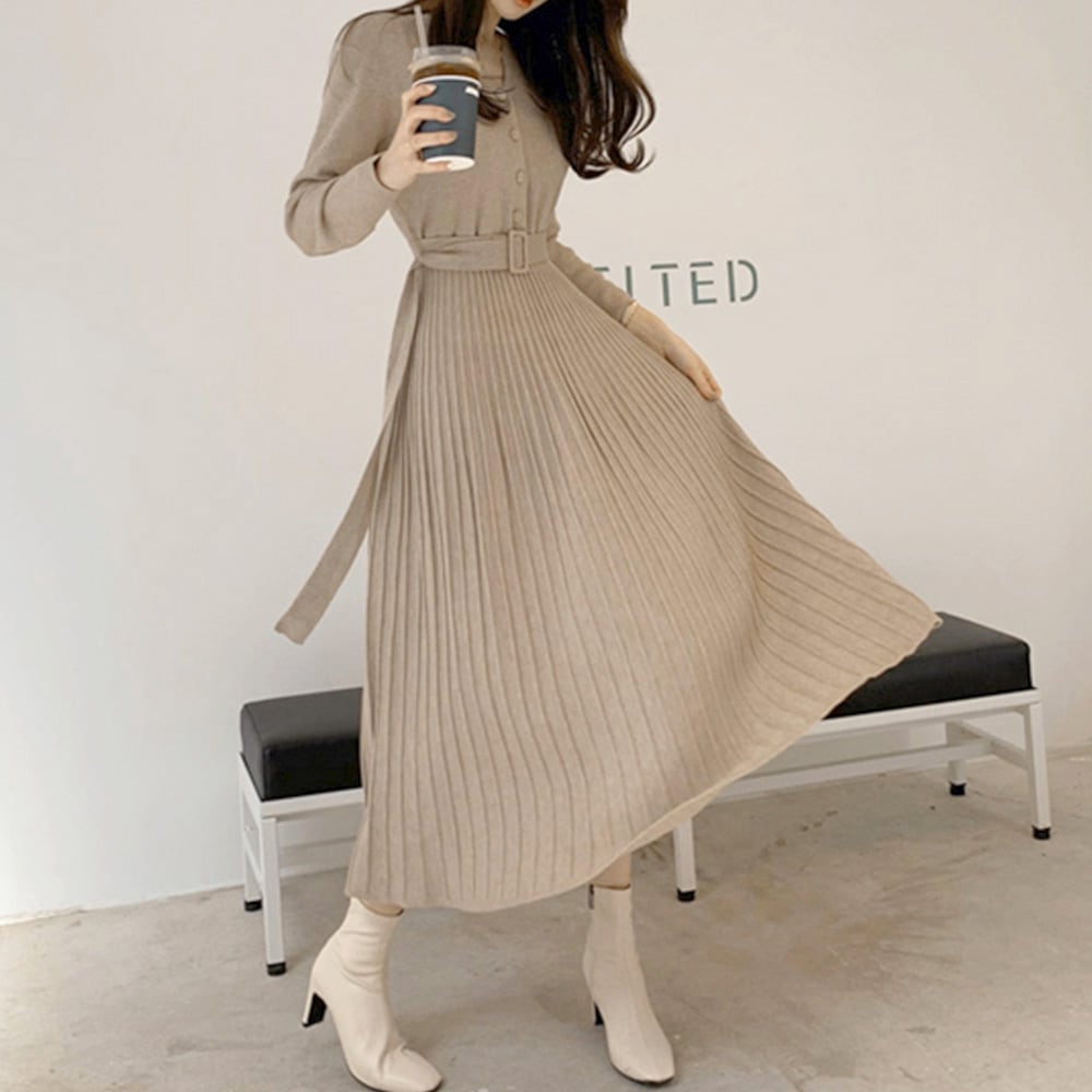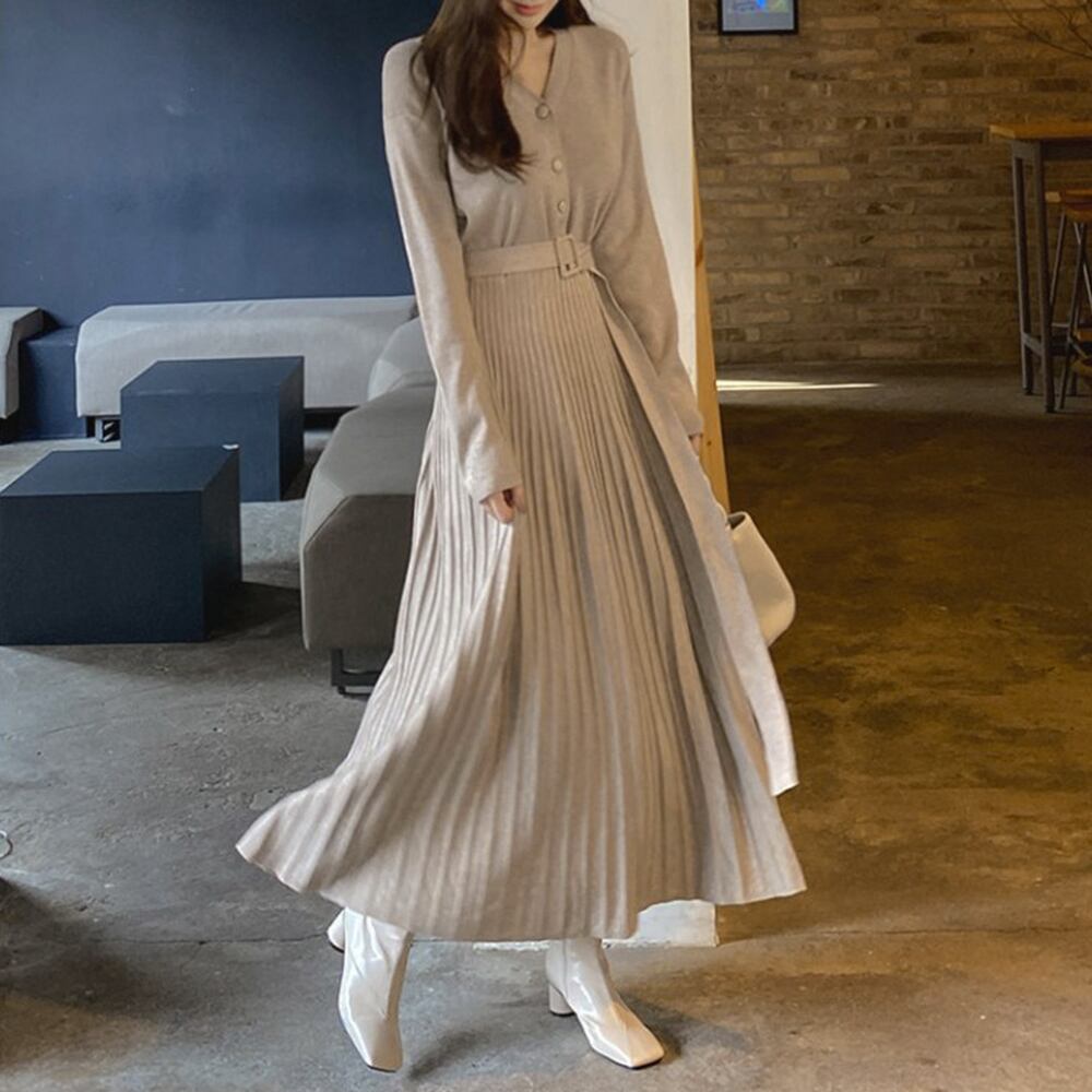 ミモレ丈 フレアワンピース レディース 秋冬 プリーツワンピース Aライン長袖ワンピ Vネックフェミニン ベルト付き