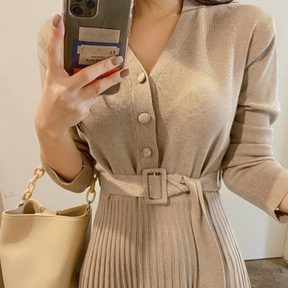 取り外しできるニットベルトが着こなしにアクセントを加え
