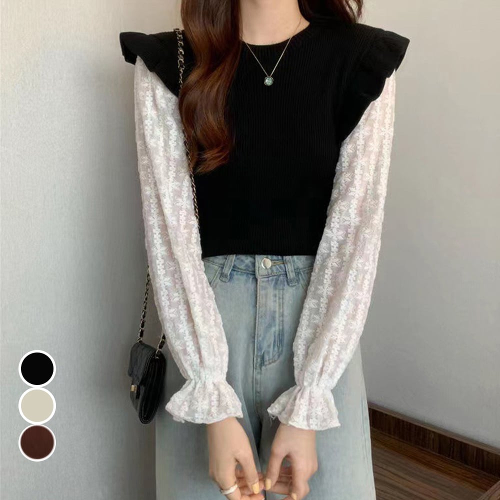 ニットセーター 重ね着風 異素材 トップス ラウンドネック レーススリーブニット フリル袖