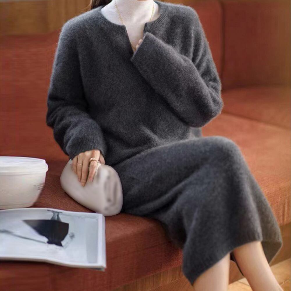 レディース 上下2点セット ニットアンサンブル キーネック 長袖 あたたかセーター ロングスカート秋冬お洒落