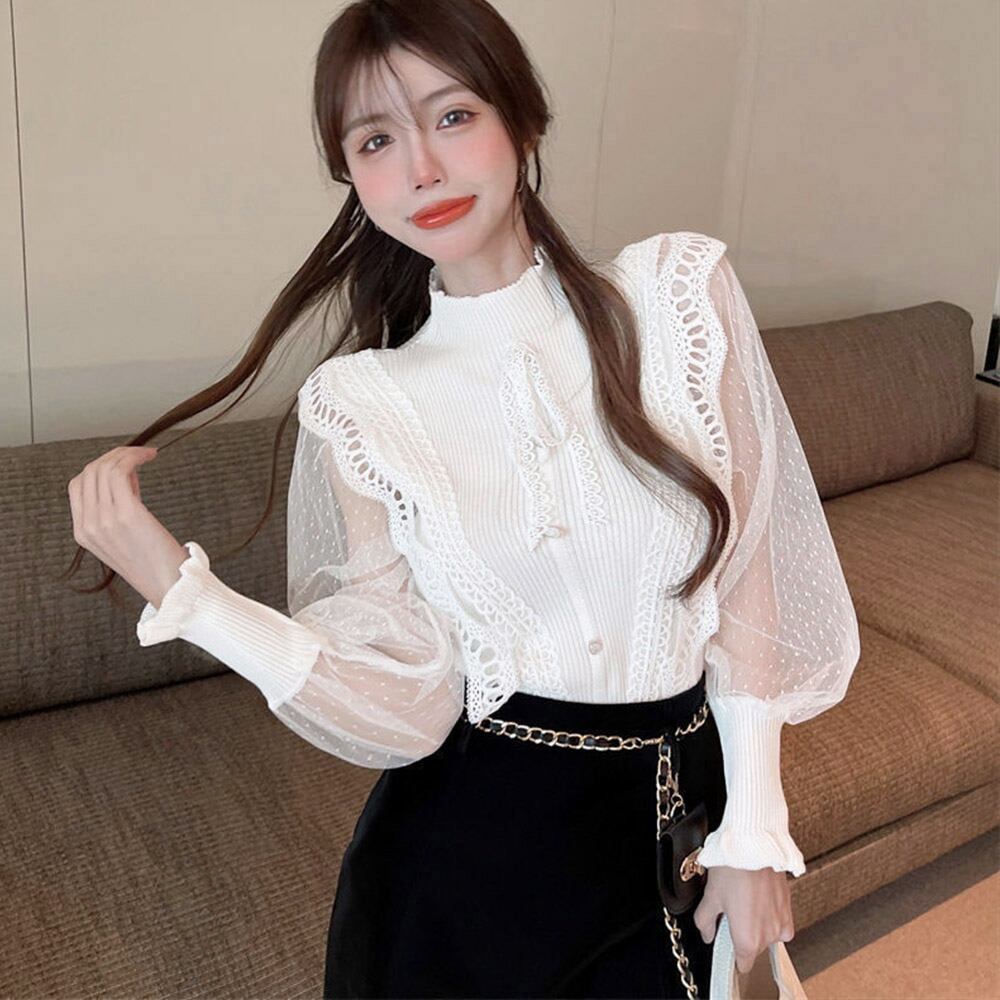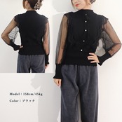 シアー素材のキャンディスリーブが女性らしさを際立たせる切り替えニットトップス