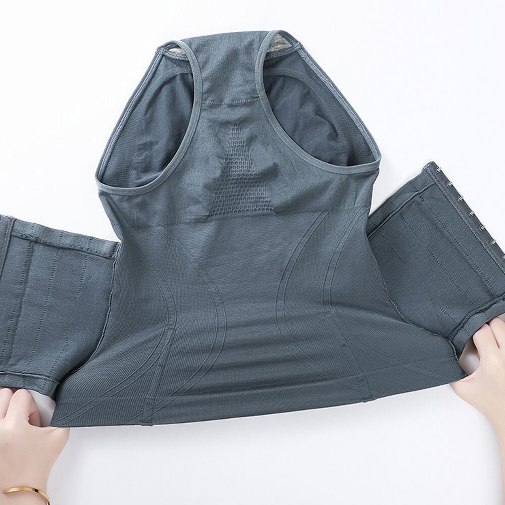 コルセット風のベルトがおなかを平らにし、ポッコリお腹をカバー