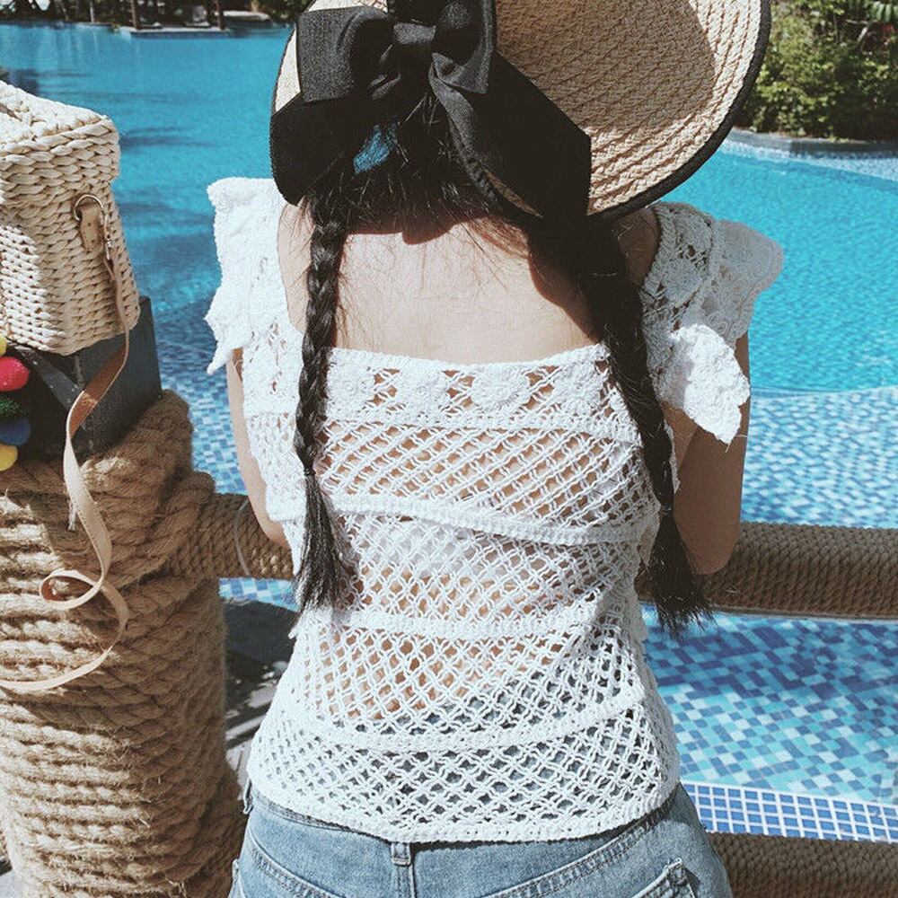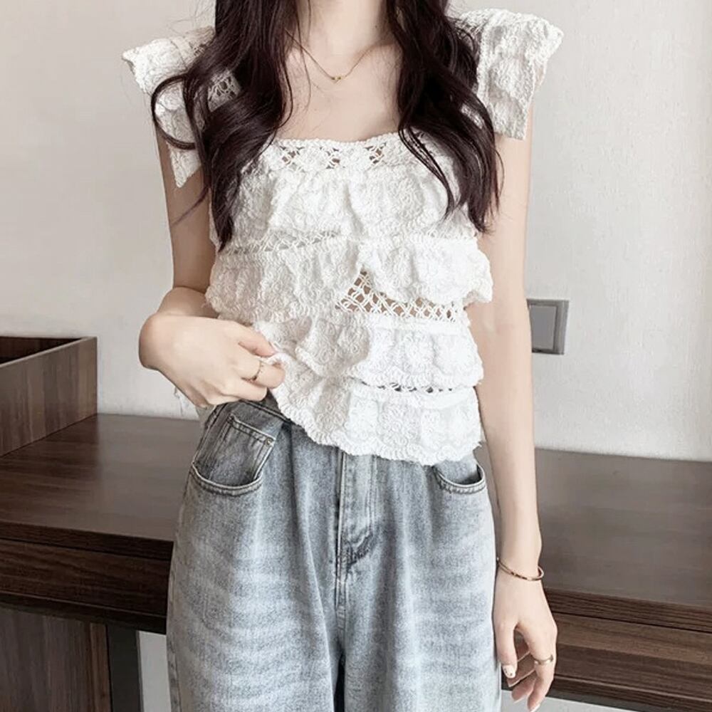 かぎ編み ベスト 肌見せ スクエアネック 重ね着 セクシー 大人可愛い フリルプルオーバー