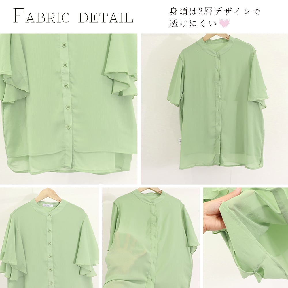 レディース 二の腕カバー シャツブラウス オフィスカジュアル とろみトップス 大人女性 ゆったりシフォンブラウス 着やせ夏服トップス きれいめ ブラウス 大人女子通勤服無地きちんと感のあるバンドカラーと、ふんわりと広がるフレアースリーブが女性らしさを高めるデザインブラウスとろみ感のある素材を使用しており、柔らかい肌触りで着心地抜群。二の腕まわりをカバーしてくれるのも嬉しいポイント◎袖だけでなく、裾にも取り入れたラッフルで女性らしさをたっぷりと取り入れたデザインジャケットにも合うサイズ感で、テーパードパンツやフレアスカートと合わせたきれいめスタイルに好相性♪素材:ポリエステル100%カラー:ブラック/ホワイト/ラベンダーグレイ/くすみブルー/ラベンダー/ミントグリーンサイズ:ワンサイズ(XL)着丈:約63cm 肩幅:約38cm 袖丈:約21cm ゆき:約40cm 身幅:約55cm 胸囲:約110cm裏地:あり伸縮性:なし透け感:ホワイトのみあり/袖部分あり生産国:中国※すべて平置きサイズです(採寸方法違いより、多少の誤差がございますので、ご了承ください)。※海外輸入品のため、商品の細部仕様は多少異なる場合がございます。予めご了承の上、ご注文お願い致します。