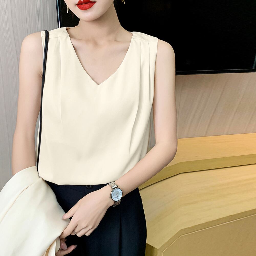 フォーマル夏服通勤 大人上品肩のタック 無地タンクトップ